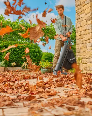A person using a leaf blower to clear fallen leaves in a garden setting.